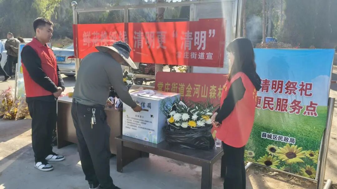 开展为期10天的移风易俗集中宣传活动,通过发放《清明节文明祭扫倡议书》、宣传车走街串巷循环播放移风易俗政策解读音频,在醒目位置悬挂横幅标语等,营造文明祭扫氛围。连续9年开展“鲜花换纸钱”活动。为有需求群众开展代客祭扫服务,利用视频直播、短视频、照片等形式,及时反馈祭扫过程。指导各公墓设立防火点、临时救护点,配备灭火器,设置集中焚烧池,确保群众祭扫安全。